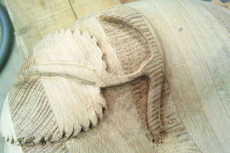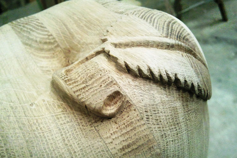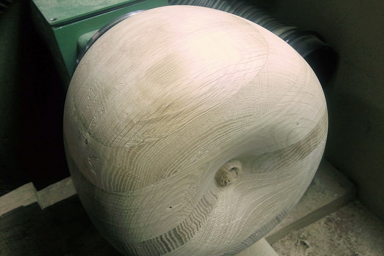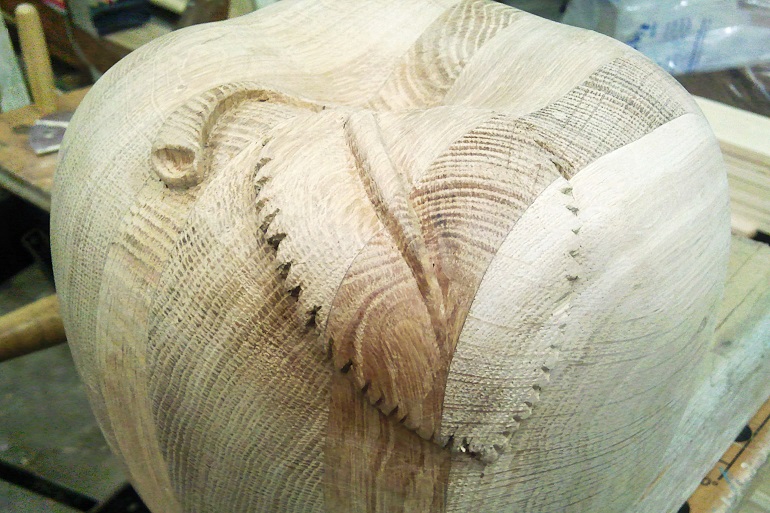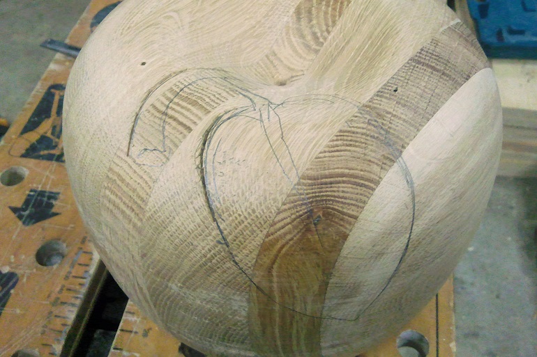 Beeldhouwwerk appel op trappaal van eikenhout. Trappaal ornament, een "organische" én monumentale toepassing. Trappaal decoratie in eikenhout, draaiwerk, snijwerk, beeldhouwwerk. Modern trapdecoratie, modern kunst, een appel met blad en stengel.
