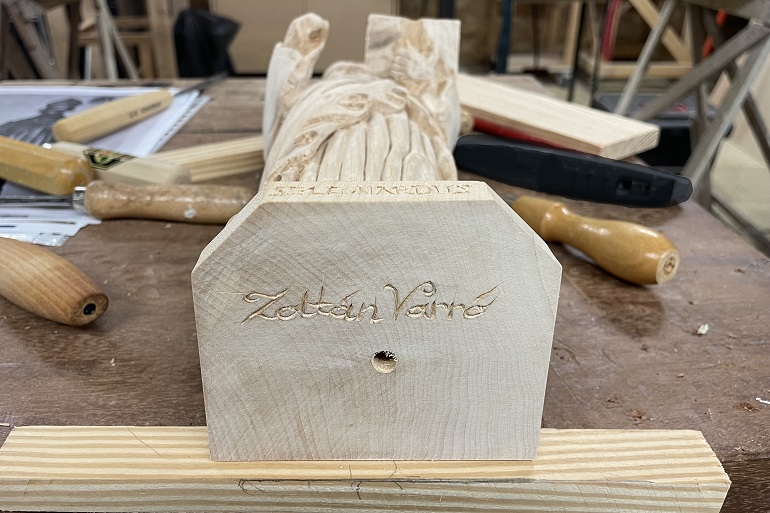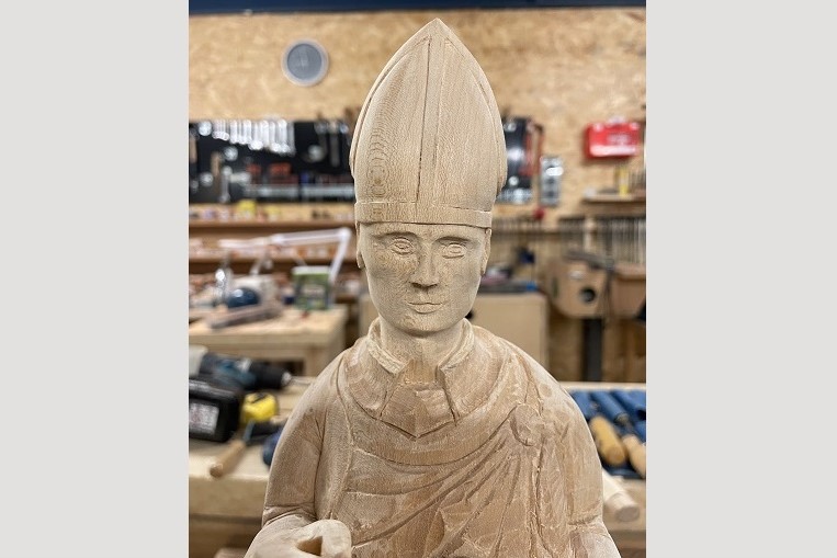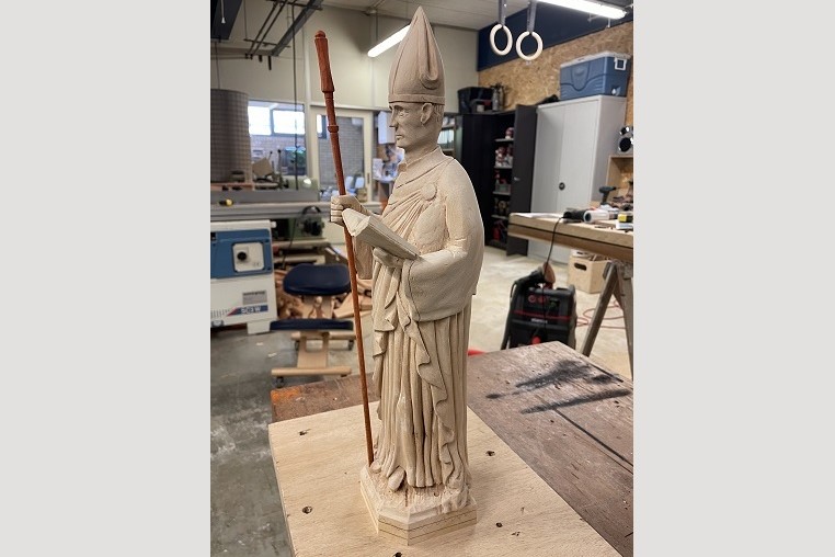 Beeldhouwwerk klein heilige beeld. Klassieke beeldhouwwerk in lindehout. Traditioneel beeldhouwen en decoratie snijwerk. Blokhout beeldhouwen van een heilige beeld. Beeldhouwwerk door Zoltan Varro. Beeldhouwen van lindehout een Sint Leonardus beeld. Traditioneel beeldhouwen en decoratie snijwerk. Snijwerk van gewaad in houten beeld.