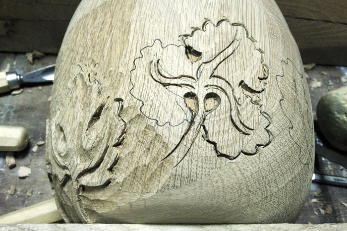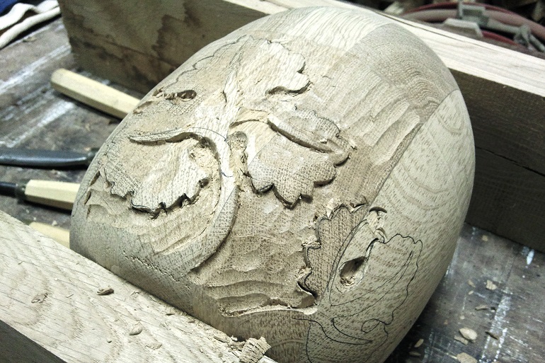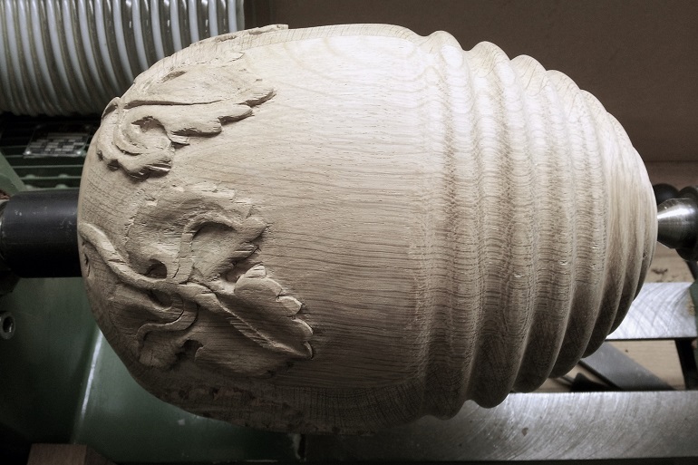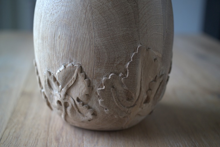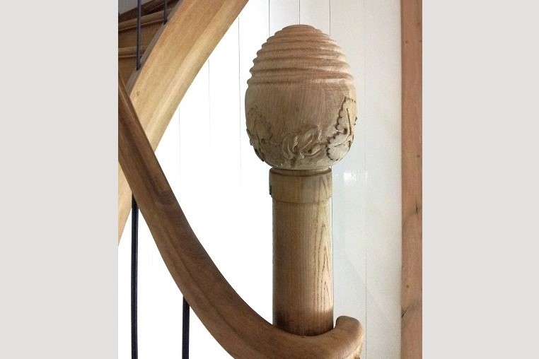 Houtsnijwerk trappaal-ei van eikenhout, met druif blad. Versierde eikenhout trappaal-bol. Druifblad motief houtsnijwerk in eiken trappaal-ei. Trappaal-bol draaiwerk van de cannelures. Trappaal -ei beeldhouwwerk in eikenhout. Snijwerk van druif bladeren in trappaal-ei.
