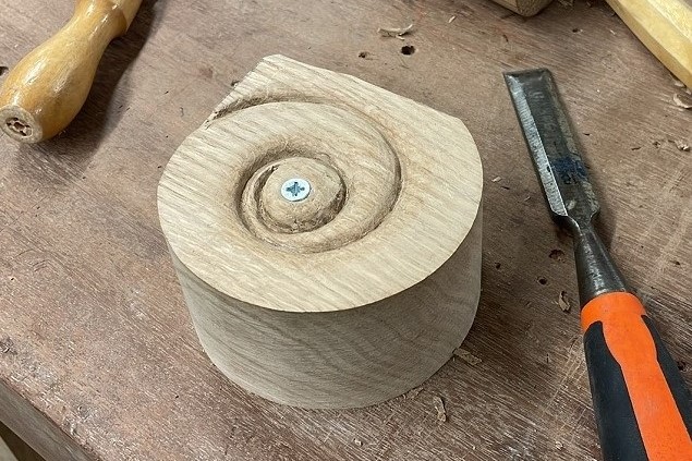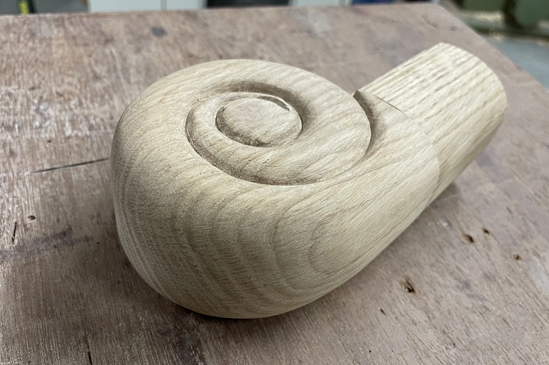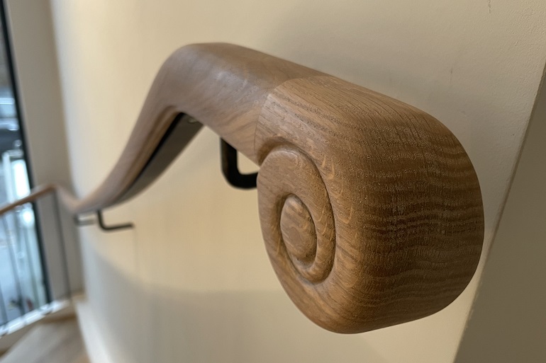 Snijwerk leuningornament, in modern stijl van eikenhout. Houtsnijwerk van een leuning krul. Beeldhouwwerk leuning eindstuk. Beeldhouwwerk trapleuning ornament.