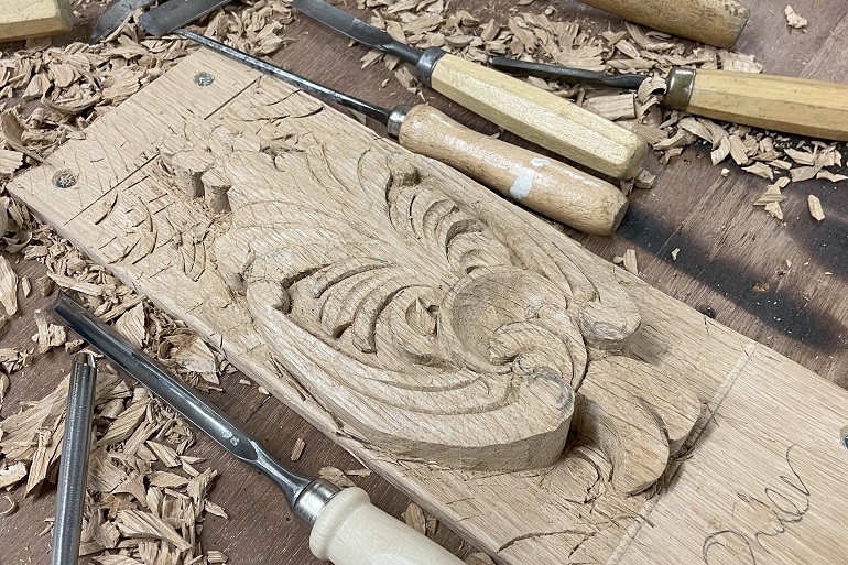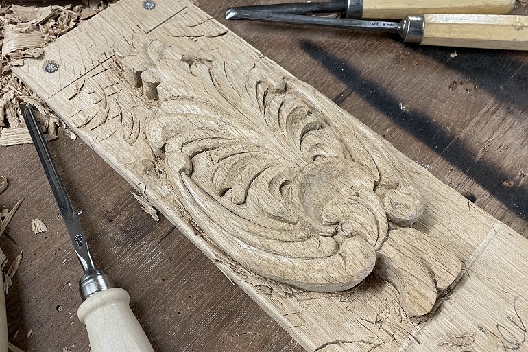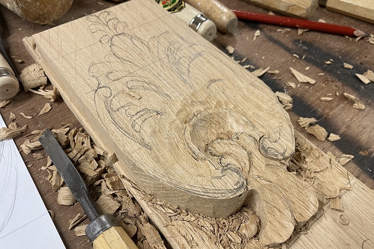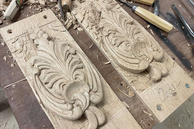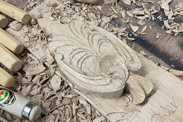 Snijwerk ornament voor binnenboom uit eikenhout. Houtsnijwerk voor de zijkant van de binnenboom van de trap. Snijwerk decoratie op de binnenboom van een prefab trap. Beeldhouwwerk voor een nieuwe trap. Snijwerk in klassieke stijl als trapdecoratie. Snijwerk van medaillons in eiken hout. Restauratie snijwerk in Barok stijl.