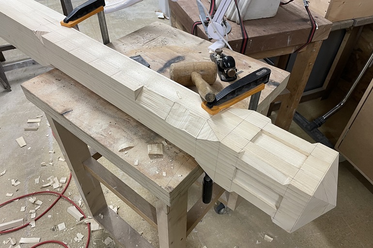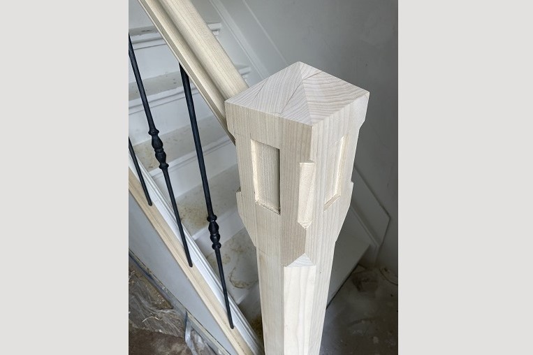 Snijwerk van een vierkante trappaal. Trappaal klassieke snijwerk decoratie.