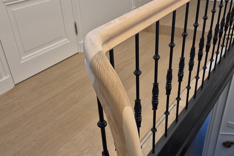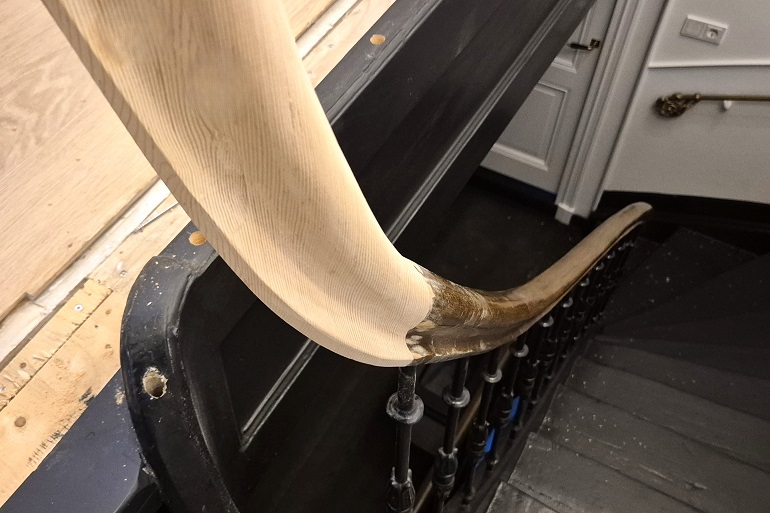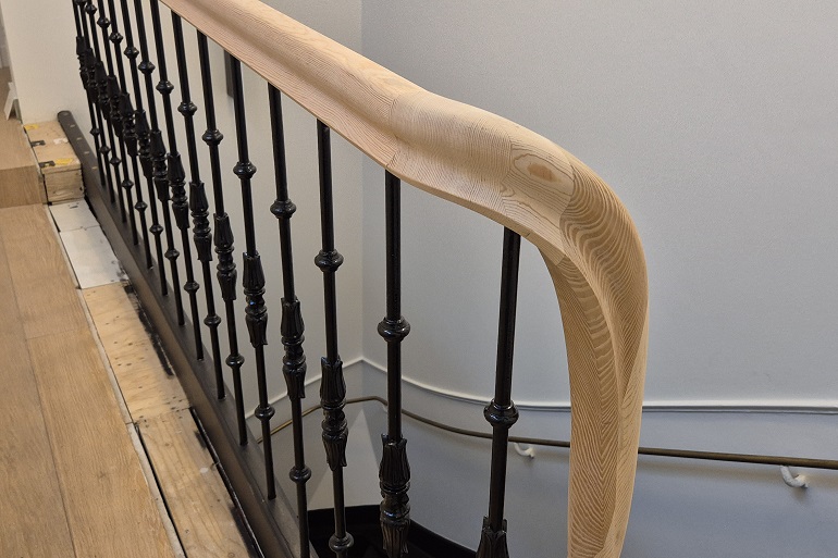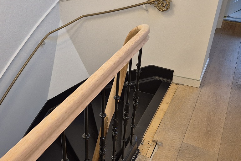 Art-Deco Trapleuning restauratie met een nieuwe wrongstuk en traphek. Restauratie trapleuning met trapspijlen. Klassieke trapleuning verlengen. Originele trapleuning herstellen. Nieuwe trapleuning met wrong en spijlen. Trapleuning met wrongstuk van Oregonpine.