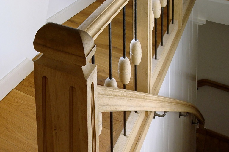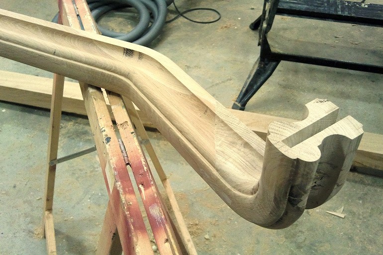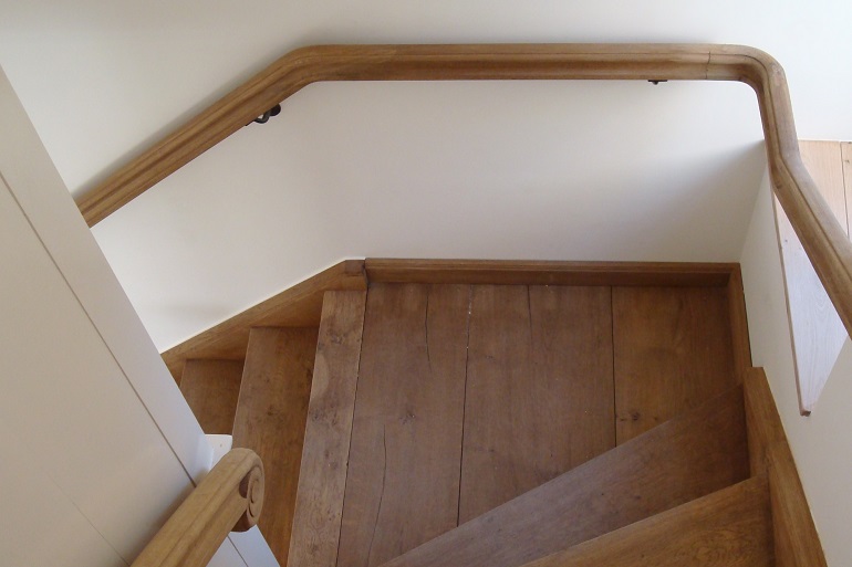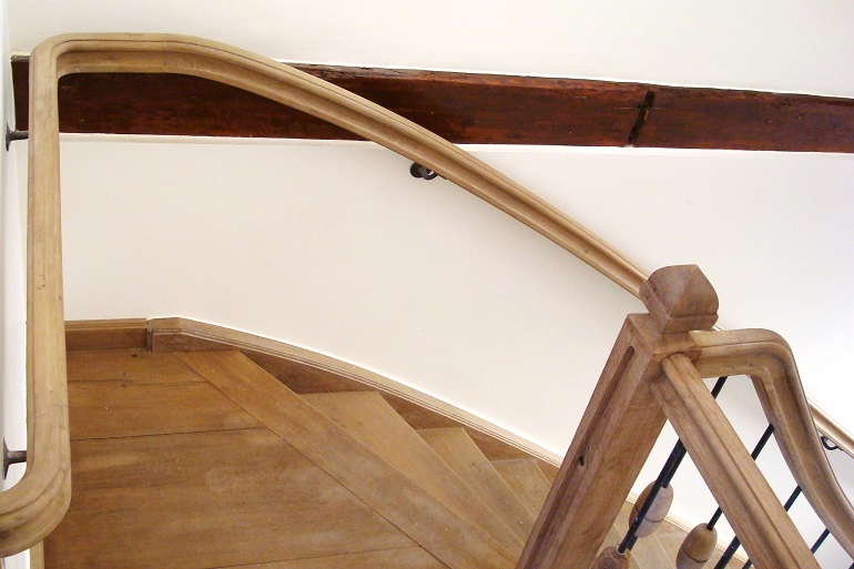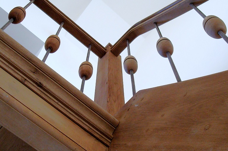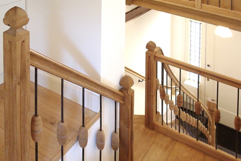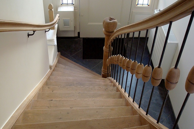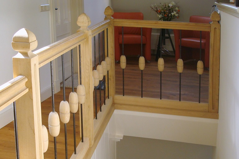 Historische trapleuning eiken hout. Muurleuning, bordesleuning op beugel met kromstukken. Bordesleuning en trapleuning met vierkante trappalen. Dubbele scheluwe trap met leuning en muurleuning. Overloop hek met trappalen en unieke ballusters. Scheluwe muurleuning op bordes met kromstukken. Stevige vierkante trappaal eikenhout met traphek en trapleuning. Trapleuning, bordesleuning, trappaal en unieke trapspijl. Trapleuning eindstuk, kromstuk, van eikenhout maken.