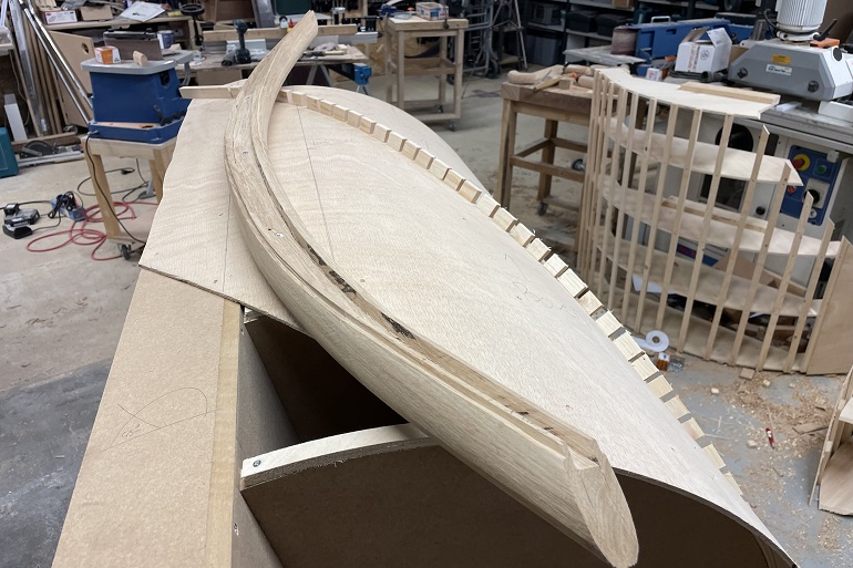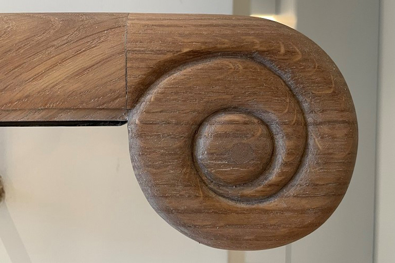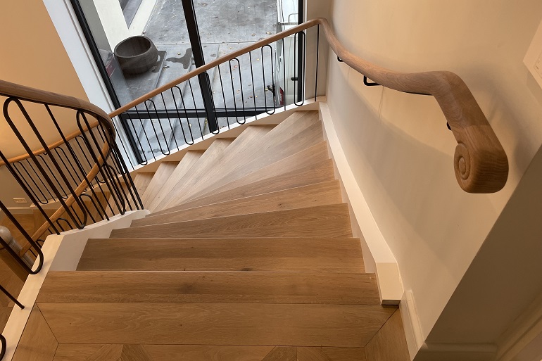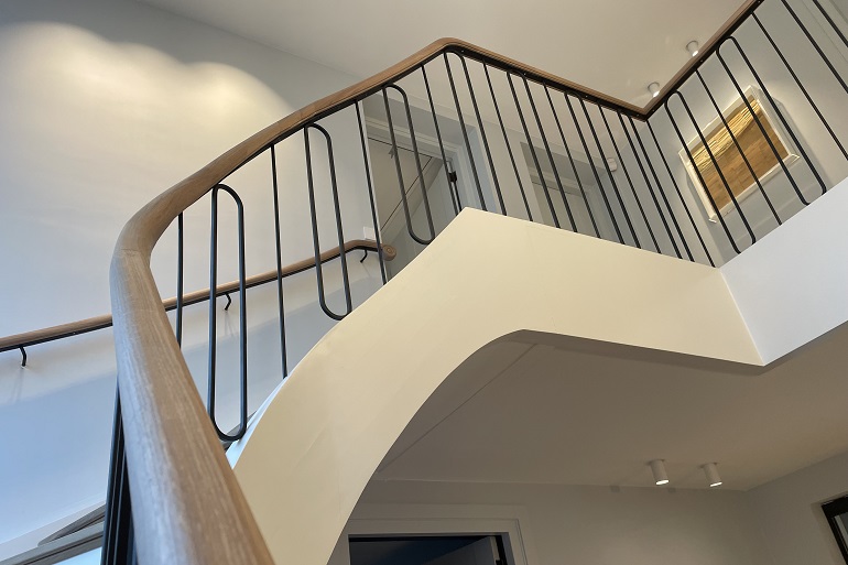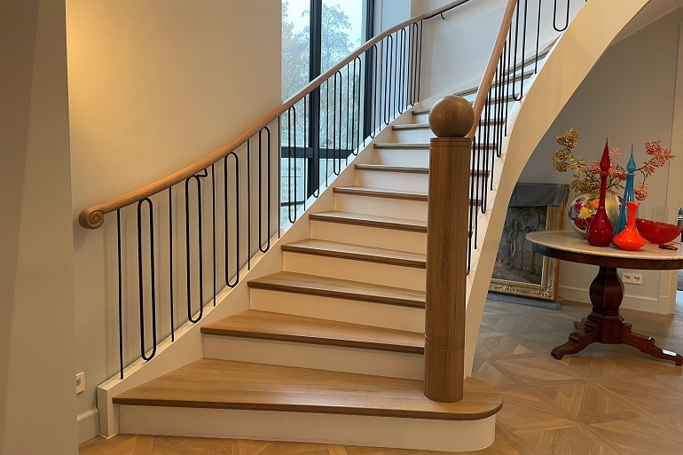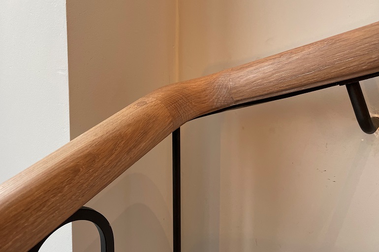 Modern eiken trapleuning op maat op een metalen hek. Trapleuning en muurleuning van eikenhout op maat gemaakt. Kleine wrongstuk op een stalen rail. Wrongstuk maken voor een eiken trapleuning. Trapleuning eindstuk door Zoltan Varro. Trapleuning en muurleuning voor scheluwe trap. Bochten, wrongen en trapleuning op maat.