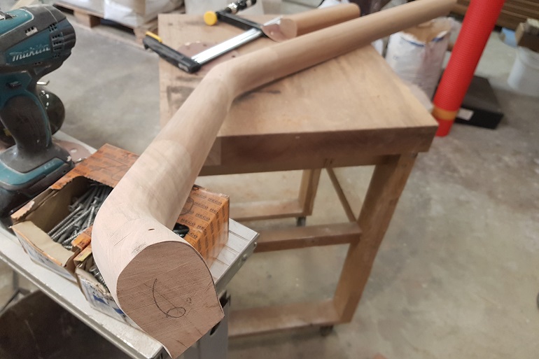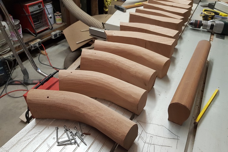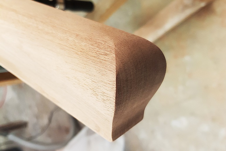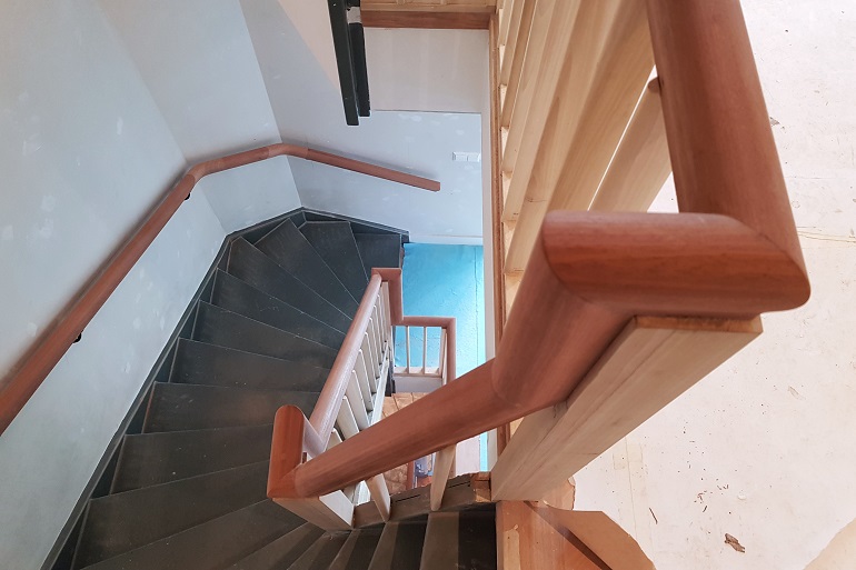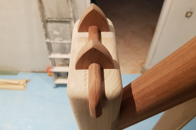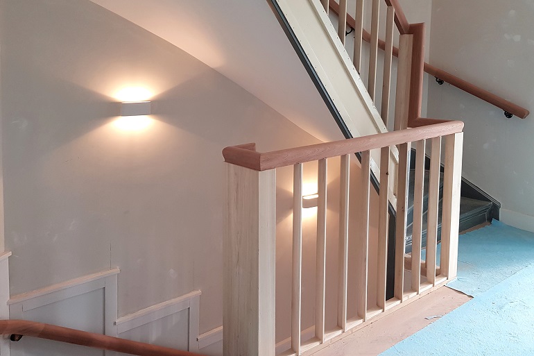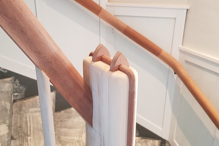 Trapleuning en muurleuning in Art-Deco stijl, doorlopend 4 verdiepingen. Fraai Art-Deco trapleuning van Mahoniehout. Sierlijk trappaal in Art-Deco stijl. Leuningstukken maken en monteren in de werkplaats. Muurleuning geplaatst op metalen leuninghouder zonder smetplank. Muurleuning en wrongstukken vooraf gemonteerd. Wrongen handmatig productie. Muurleuning sierlijk eindstuk. Trapleuning en traphek op de overloop. Trappaal Art-Deco mahonie decoratie.