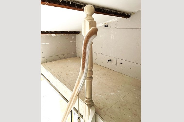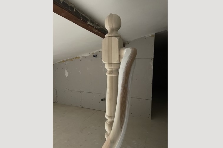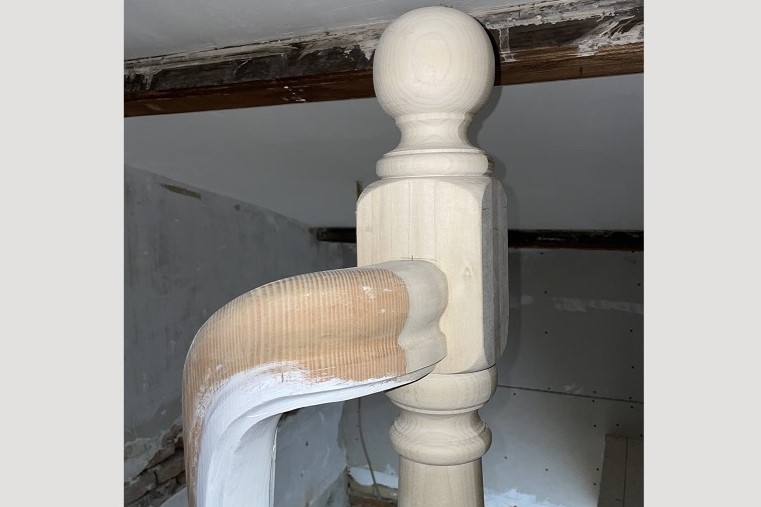 Gedraaide trappaal met bol voor een trapverlenging. Trappaal met wrong en een kleine bol. Trappaal namaken met bol en nieuwe trapleuning. Trappaal op maat draaien. Trappaal en trapleuning maken voor renovatie.