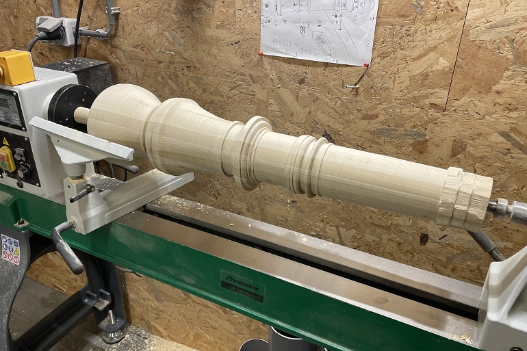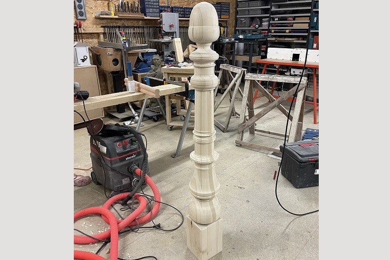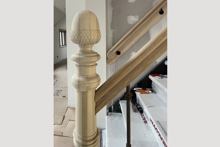 Klassieke trappaal met eikel snijwerk en trapleuning. Klassieke trappaal met leuning en beeldhouwwerk. Massieve trappaal draaien. Trappaal-bol als eikel houtsnijwerk.