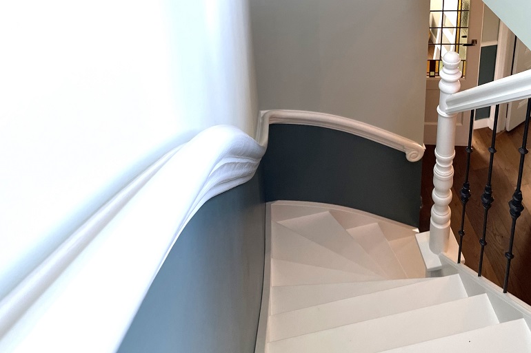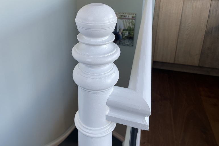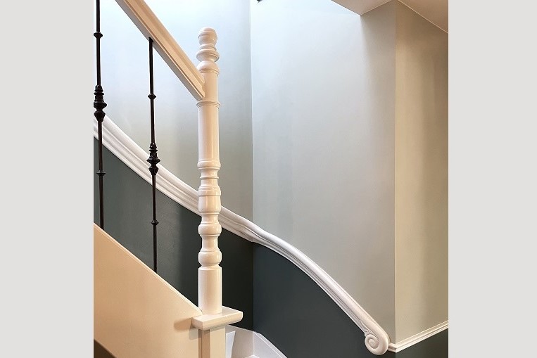 Trappalen gedraaid, nieuw, voor renovatie project. Drietal trappalen met traphek, trapleuning, bloktrede en binnenboom op een nieuwe prefab trap. De palen en leuningen zijn gekopieerd van de bestaande en verlengt naar de bovenste verdieping.