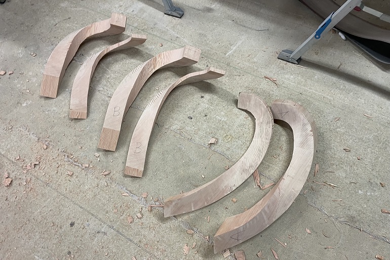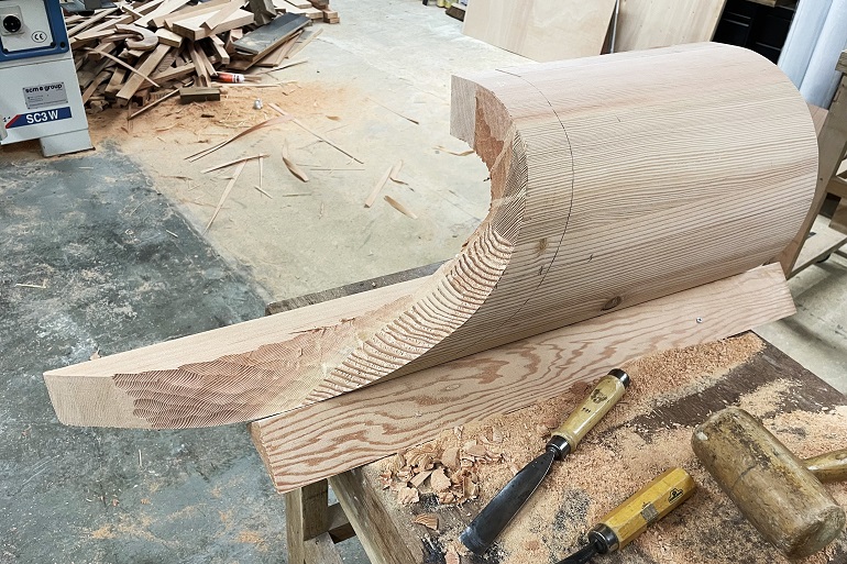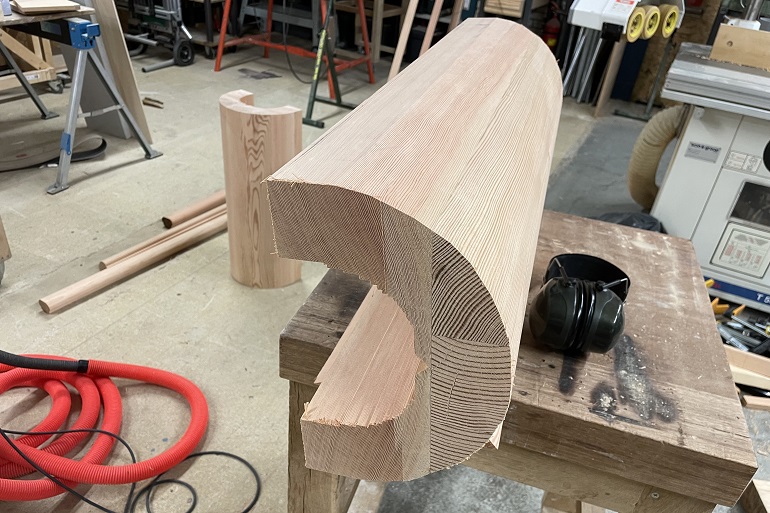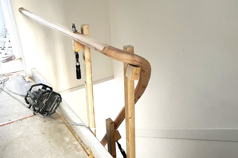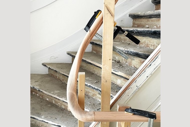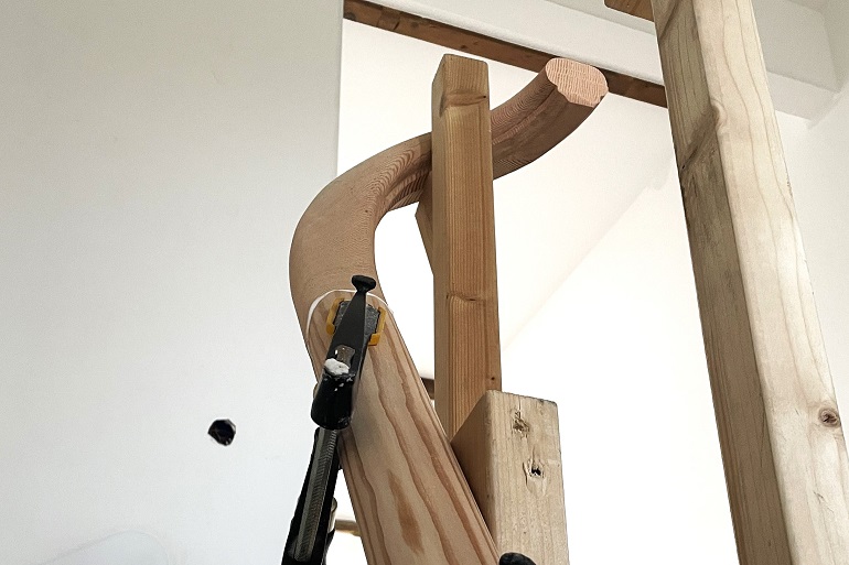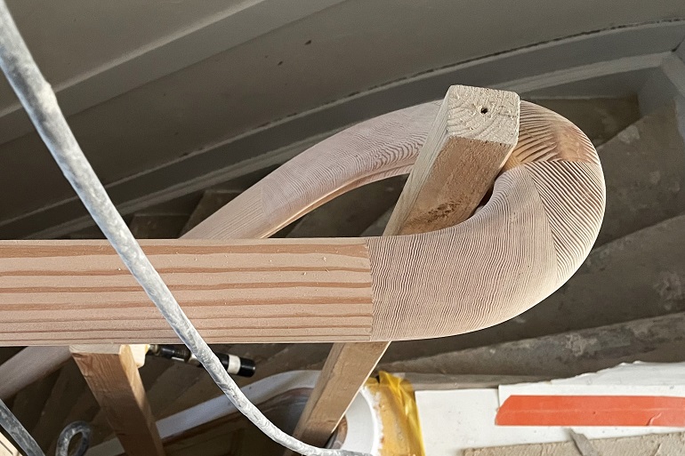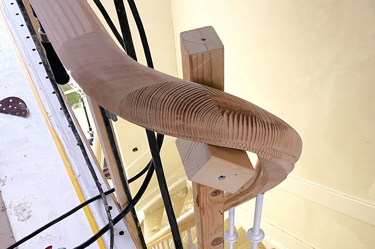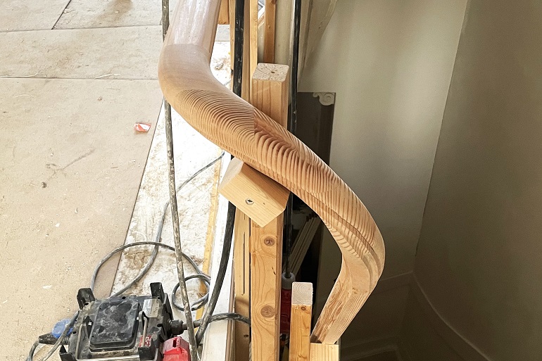 Wrongen in trapleuning, doorlopende leuning op meerdere verdiepingen, gemaakt van Oregonpine. In Rotterdamse klassieke woning met beschermd status. De complete trapleuning is gereconstrueerd. Handgemaakte klassieke trapleuning. Wrongen en binnenboom profiel proces. Wrongen maken beeldhouwwerk, met de hand. Wrongen en leuning installatie. Wrongstukken ambachtelijk maatwerk. Beeldhouw wrongen in klassieke stijl.