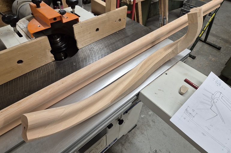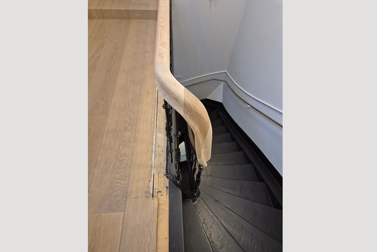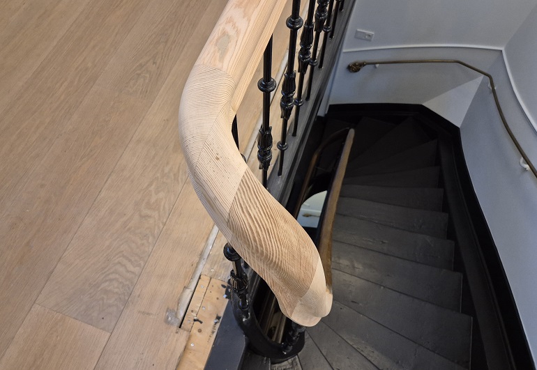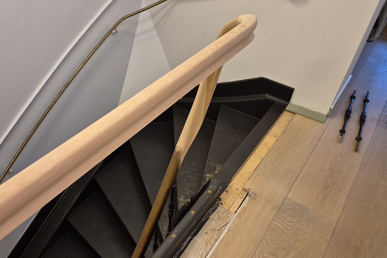 Wrongstuk maken voor Art-Deco trapleuning. Aangepaste wrongstuk voor een klassieke trap. Wrongstuk beeldhouwwerk, reconstructie van de oude leuning.